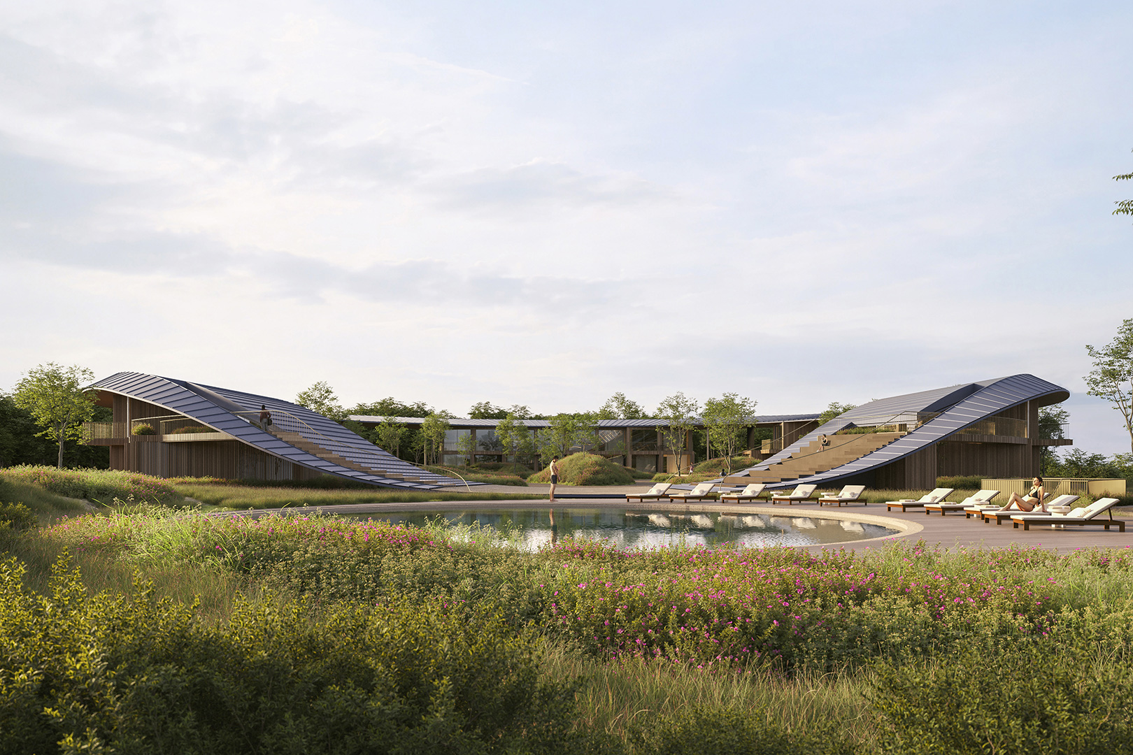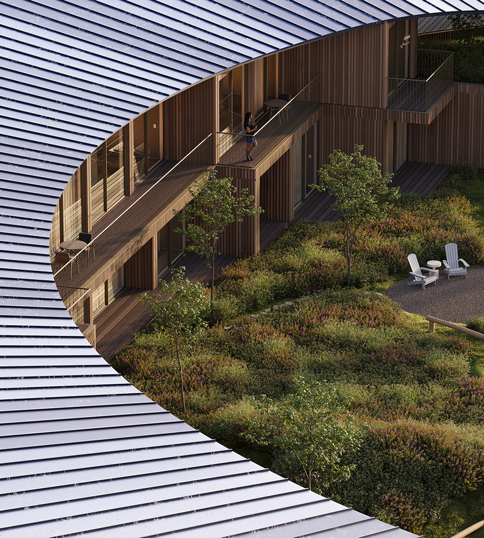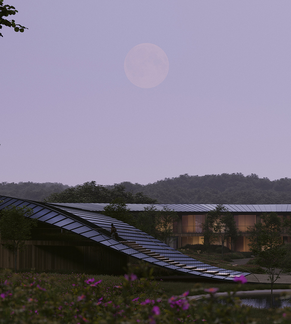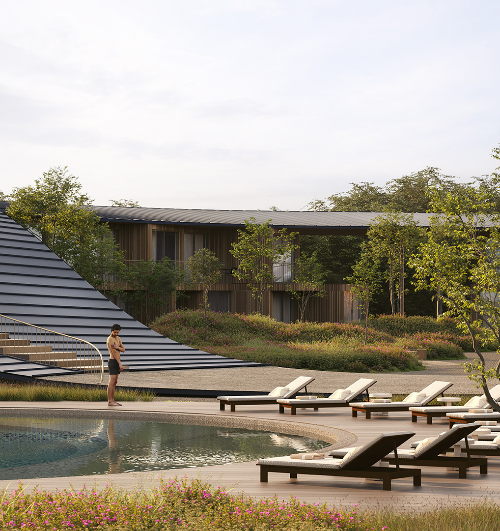 The project interweaves a hotel, a multi-purpose building and a spa, each housed in its own distinct structure.The design revolves around a central plaza, with each room enjoying a framed view of the landscape.A versatile multi-purpose space adapts to accommodate a wide range of events.