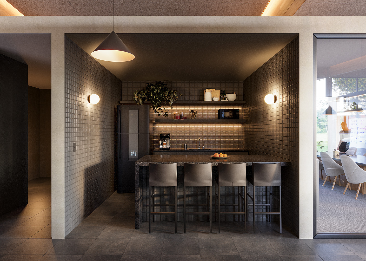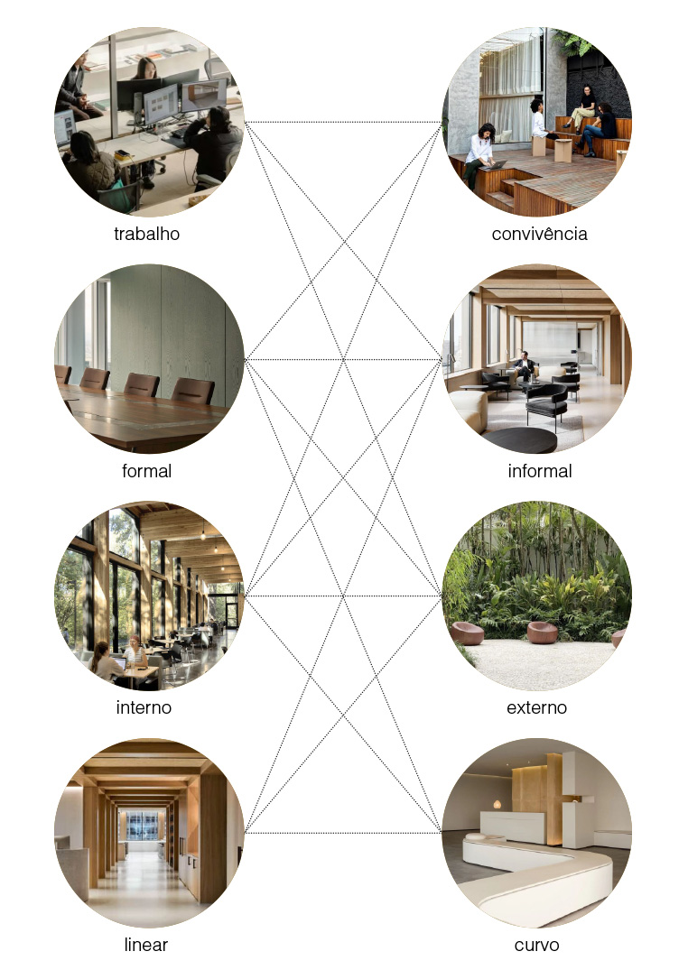 The interior design seeks to connect the workplace with spaces for social interaction, the formal with the informal, reflected in the harmony between linear and curved elements and in the integration of exterior and interior spaces.