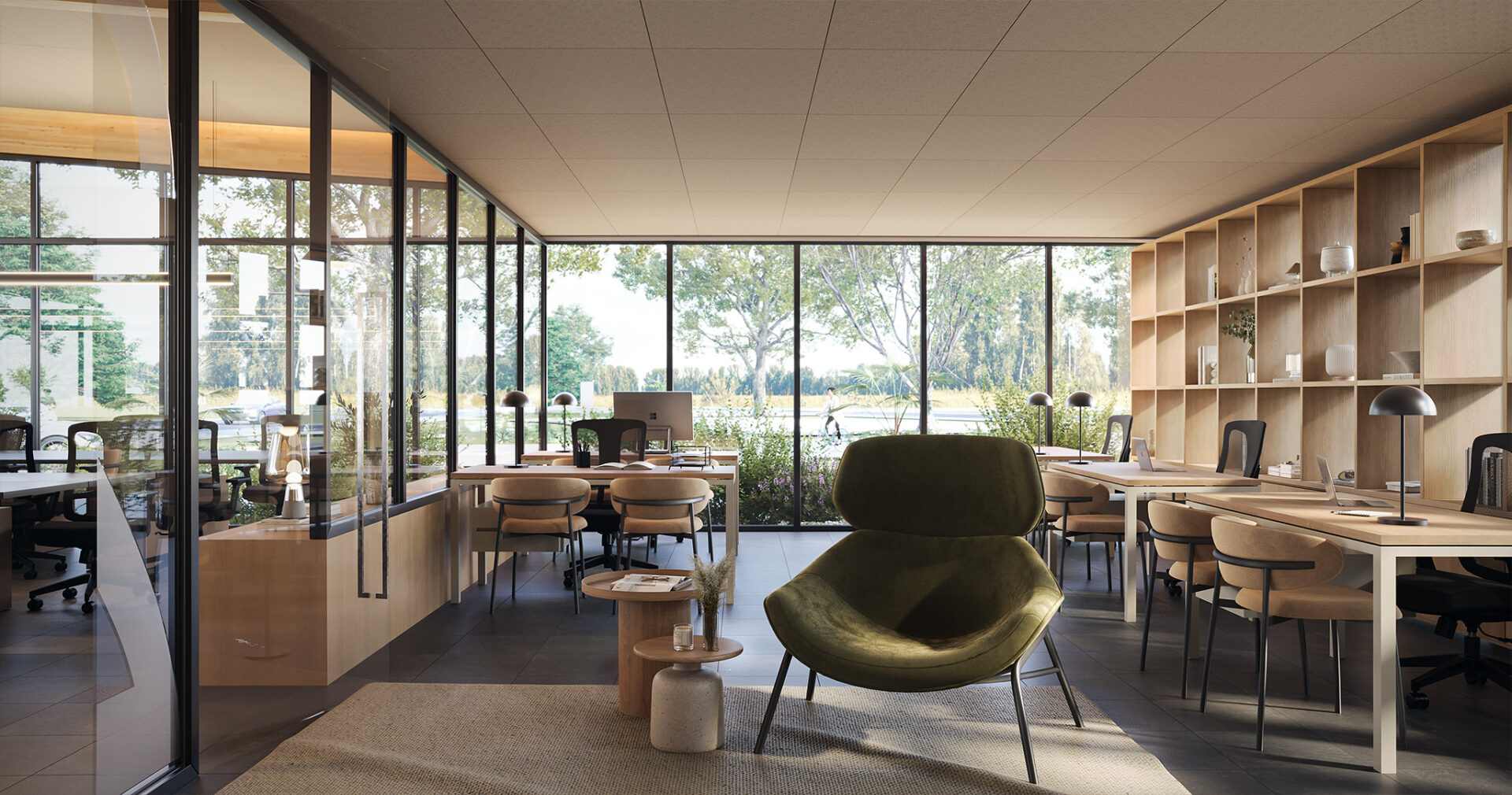 Para o interior design, busca-se a conexão do ambiente de trabalho ao de convívio, do formal ao informal, o que reflete-se na harmonia entre o linear e o curvo e na integração entre o externo e o interno.